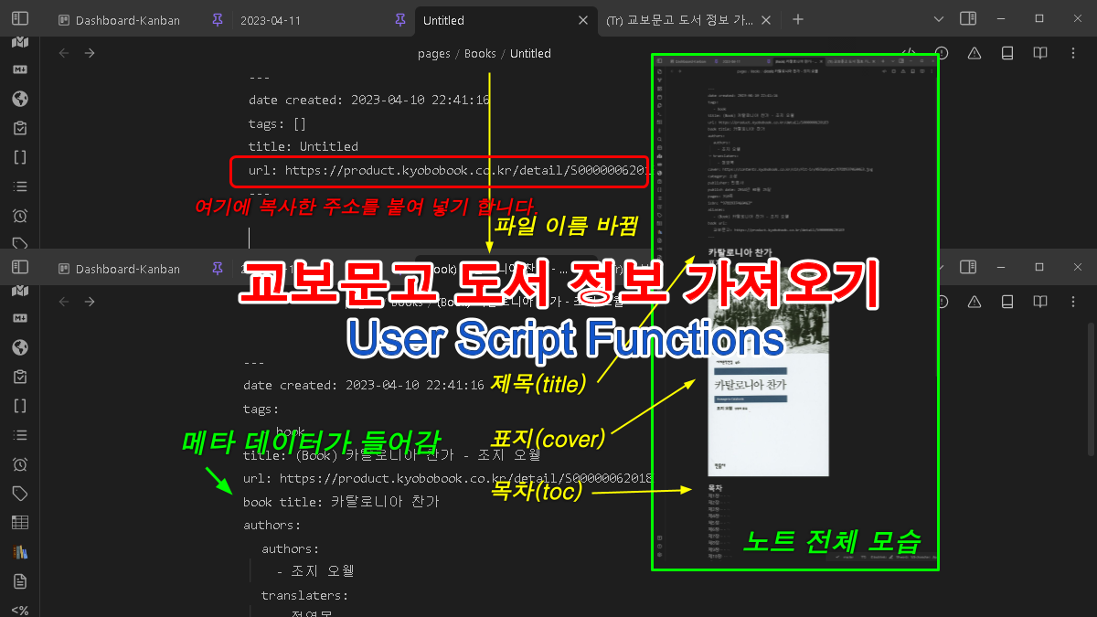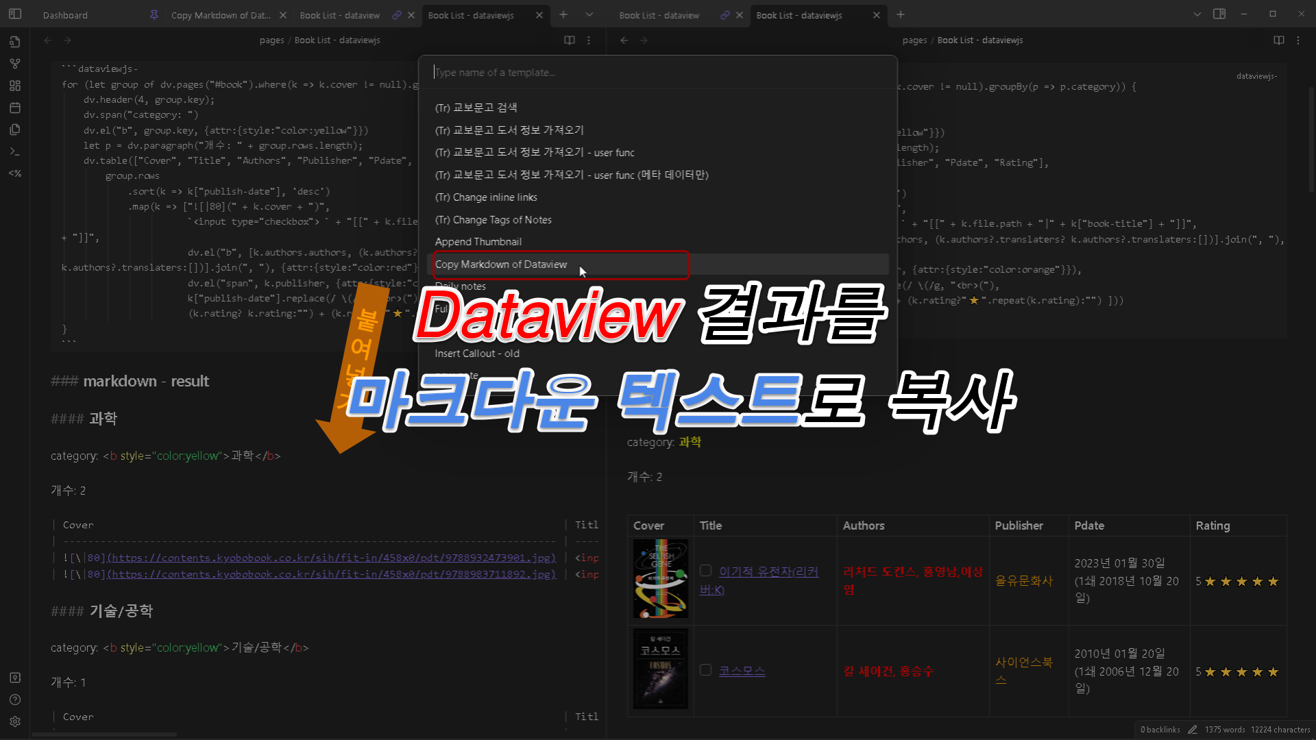 dataview나 dataviewjs 코드블록에 커서(캐럿)를 위치시켜고템플릿을 실행하면 클립보드로 그 Dataview 결과를 마크다운 형식으로 복사합니다.복사된 내용을 바라는 곳에 어디에나 붙여넣기(Ctrl + V) 하면 됩니다.얼마 전에 Dataview로 바라는 파일들 목록 표를 만들어 그 가운데서도 세부적으로 더 일부만 선택하여 한꺼번에 여러 노트의 메타데이터 태그를 바꾸는 템플릿을 만들었습니다. (아래 링크) 옵시디언 - 한꺼번에 여러 노트의 태그들을 바꾸기(Feat. 템플레이터 & 데이터뷰) https://eoureo.tistory.com/entry/옵시디언-한꺼번에-여러-노트의-태그들을-바꾸기-Feat-템플레이터-데이터뷰여기에 더해서 파일 목록 표에 열을 추가하고 고칠 수 있으면 더 많은 것을..